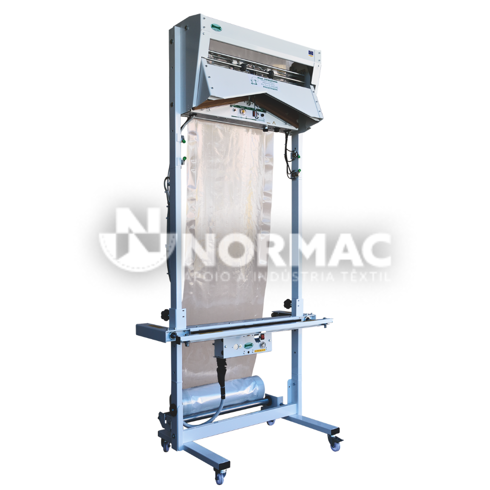 Máquina de Embalar pneumática com soldadura e com corte oblíquo e reto, com pé incorporado e suporte para o rolo na parte superior. Equipada com sistema de soldagem superior e inferior. Possibilidade de colocar manga de 400 a 620 mm.