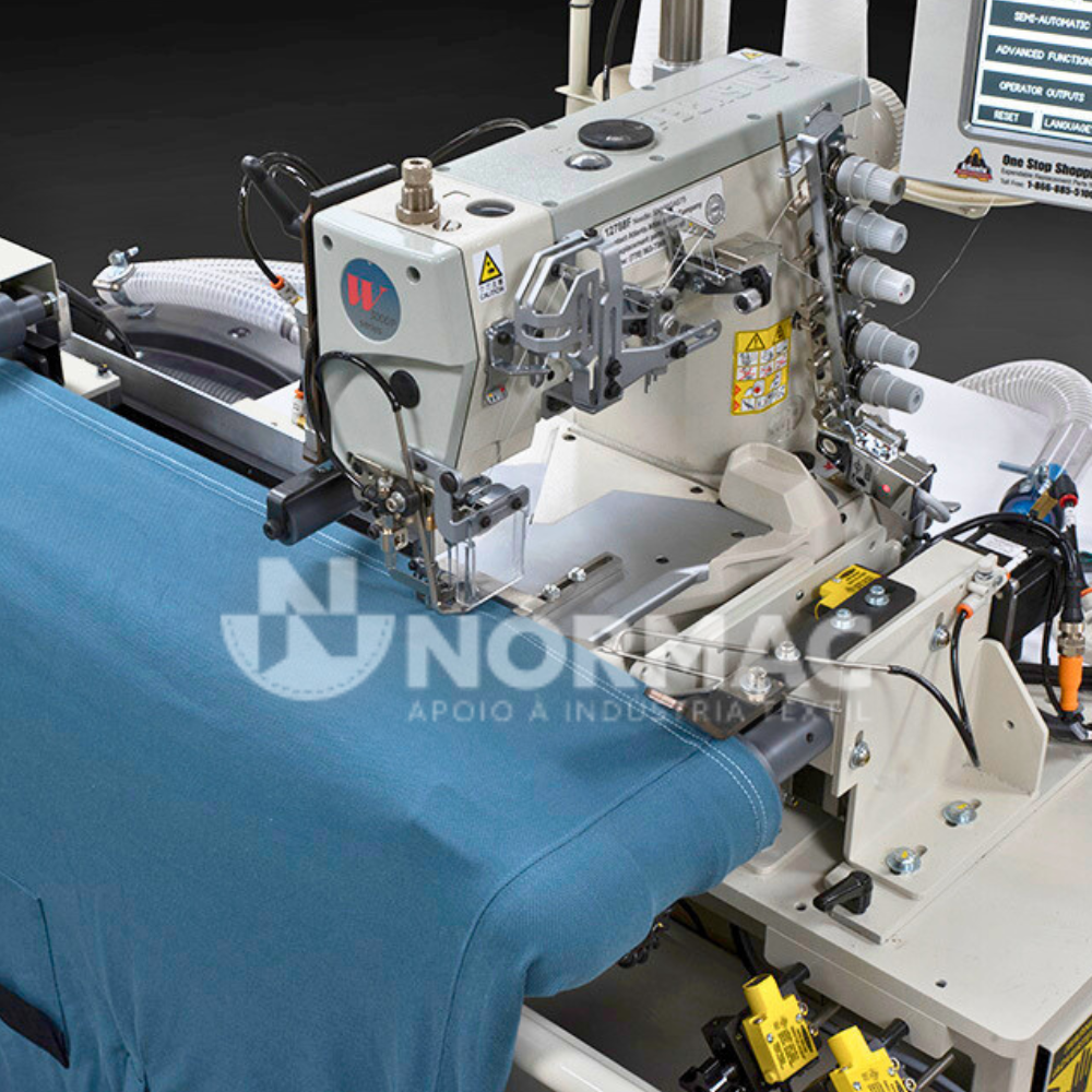 A peça tubular ou com costura lateral é posta nos rolos de expansão. Quando carregados, os rolos expandem até a tensão adequada, posicionam a costura da peça sob o calcador e o ciclo de costura é iniciado. O operador tem liberdade para operar uma segunda maquina. A bainha finalizada é detectada e perfeitamente costurada (com condensação de pontos, se desejado). É efetuado o corte de linha e a peça é empilhada automaticamente.