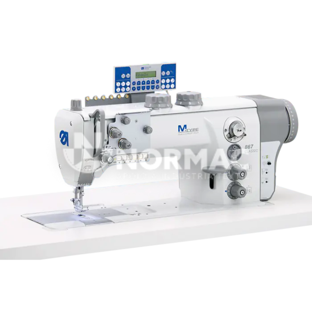 As máquinas de costura M-TYPE com equipamento completo eletropneumático e alimentação tripla são equipadas com todos os recursos de desempenho e vantagens típicos da versão M-TYPE.