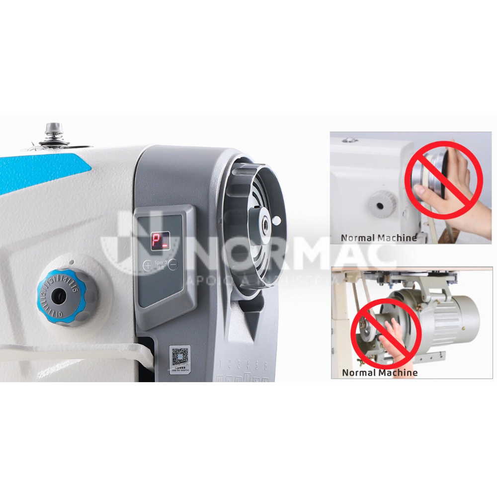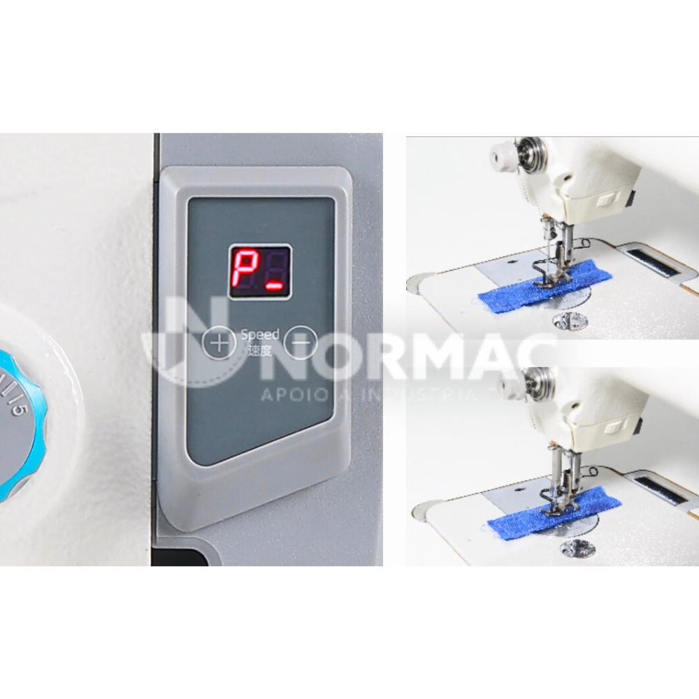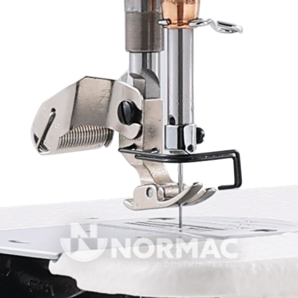 Máquina de Costura de Ponto Corrido de 1 agulha, com motor económico, cárter de óleo aberto e alavanca de remates.
