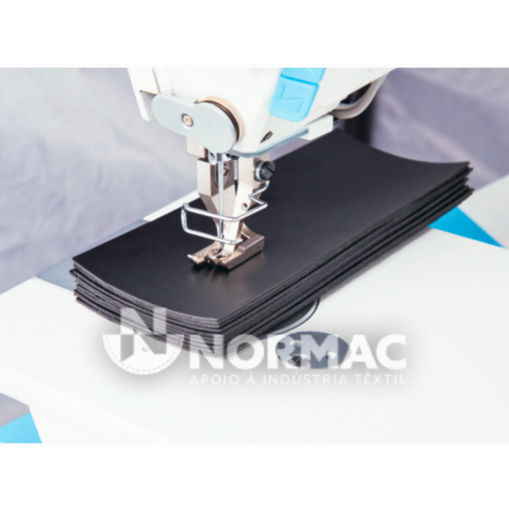 Máquina de Costura de Ponto Corrido automática de 1 agulha com duplo transporte efetuado com arrasto inferior e superior adequado para costurar materiais mais grossos (como bolsas, almofadas, luvas de couro), equipada com um motor económico de energia embutido diretamente na cabeça da máquina.