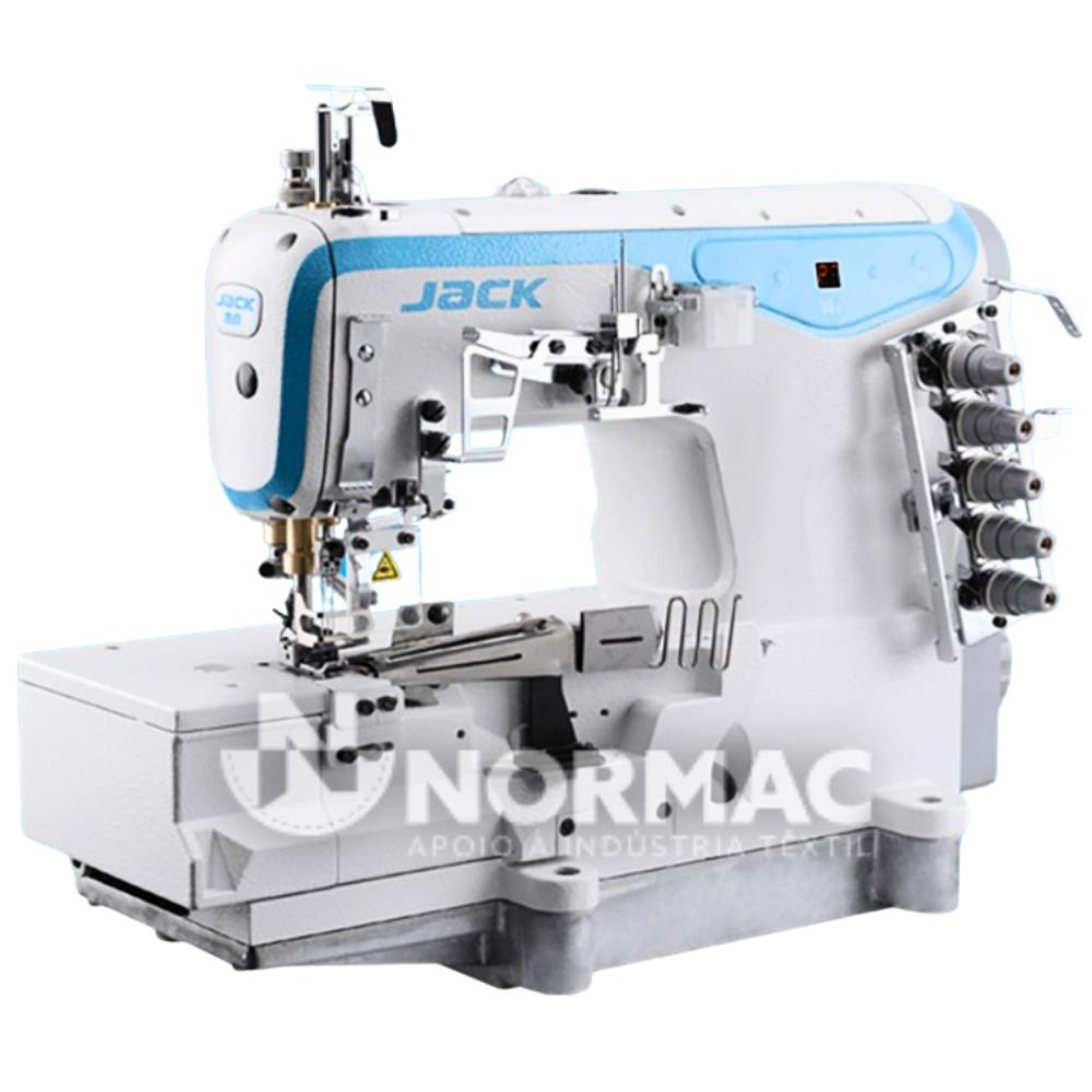 Máquina de Costura de Recobrimento e Colarete moderna de 3 agulhas, com base plana, equipada com um motor de economia de energia montado na cabeça, que garante uma operação silenciosa e a menor consumo de energia. A máquina é equipada com iluminação LED, com a possibilidade de ajustar a intensidade da luz em 3 níveis.
