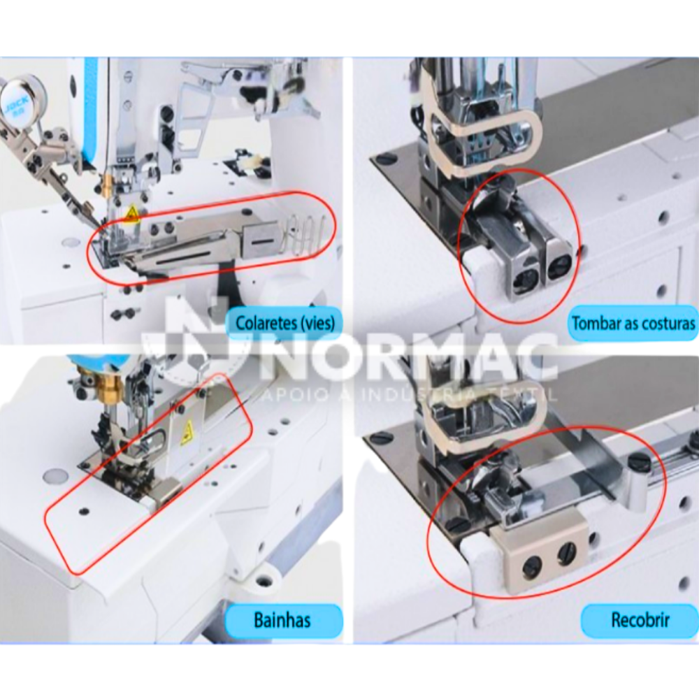 Máquina de Costura de 3 agulhas equipada com kit de Recobrimento, de Colarete, de Tombar Costuras e de fazer Bainhas