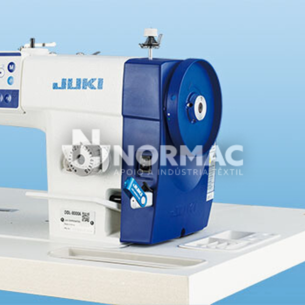 Máquina de Ponto Corrido JUKI DDL-8000AS-MS para tecidos médios, cabeça semi-seca para evitar manchas de óleo, com ecrã tátil e guia de voz.
