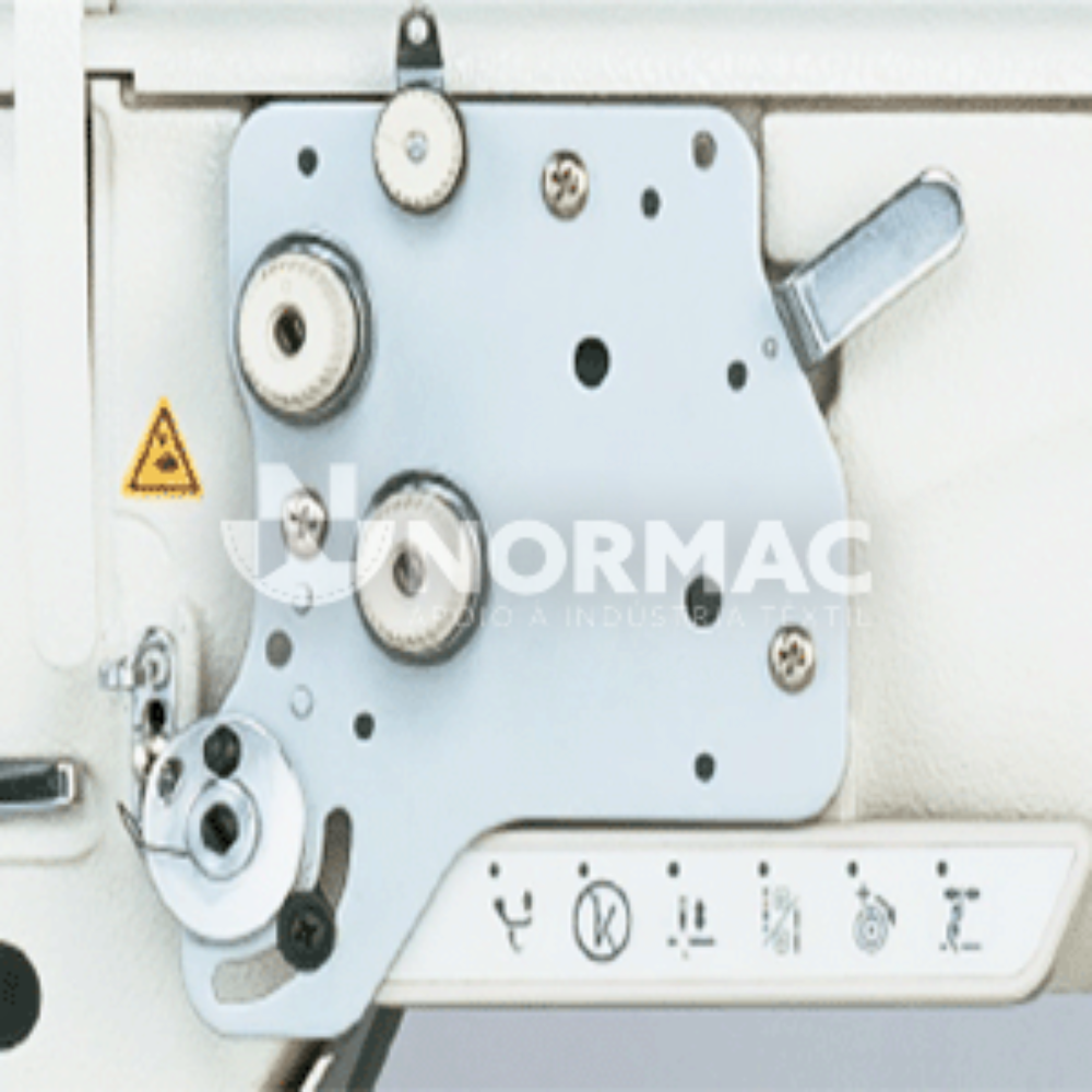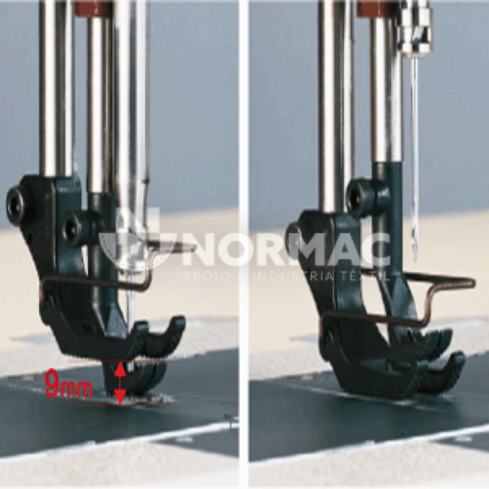 Máquina de Costura de Ponto Corrido de Triplo Arrasto de braço longo. A longa distância entre o braço da máquina e a posição da agulha contribui para um melhor manuseio do trabalho a costurar. Esta máquina é adequada para a costurar materiais pesados, como estofos de automóvel, toldos em lona, sofás, bolsas, etc..
