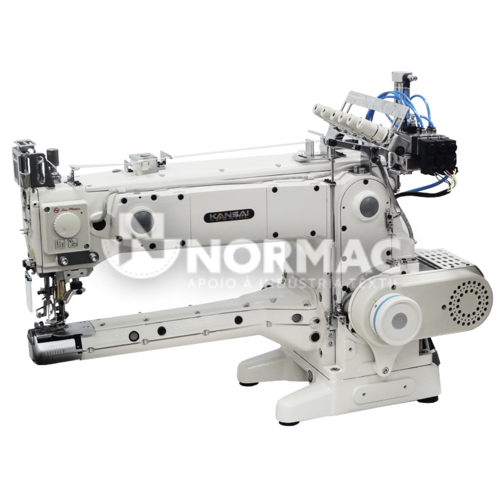 Máquina de Costura de Recobrir 3 agulhas com recobridor superior braço frontal extra longo para facilitar os trabalhos com costuras compridas, com Pulley digital para facilitar os ajustes técnicos na máquina.