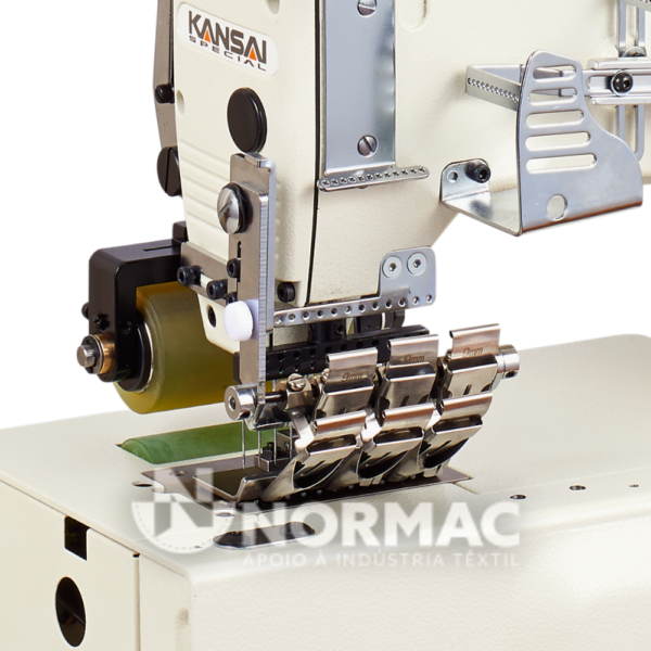Máquina de Costura de Ponto de Cadeia Duplo de 12 agulhas, base plana, puller traseiro liso em borracha com equipamento para aplicar múltiplos malhetes ou fitas.