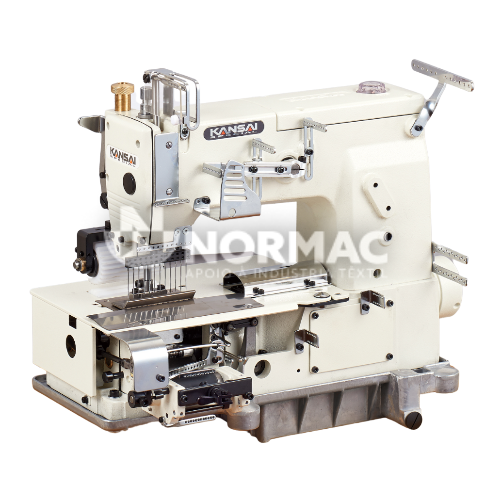 Máquina de Costura base plana de Ponto de Cadeia Duplo de 12 agulhas, com linha fiada nas agulhas e crochets, entrando na costura uma 3ª linha elástica entre ambas para produzir o franzido.