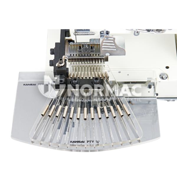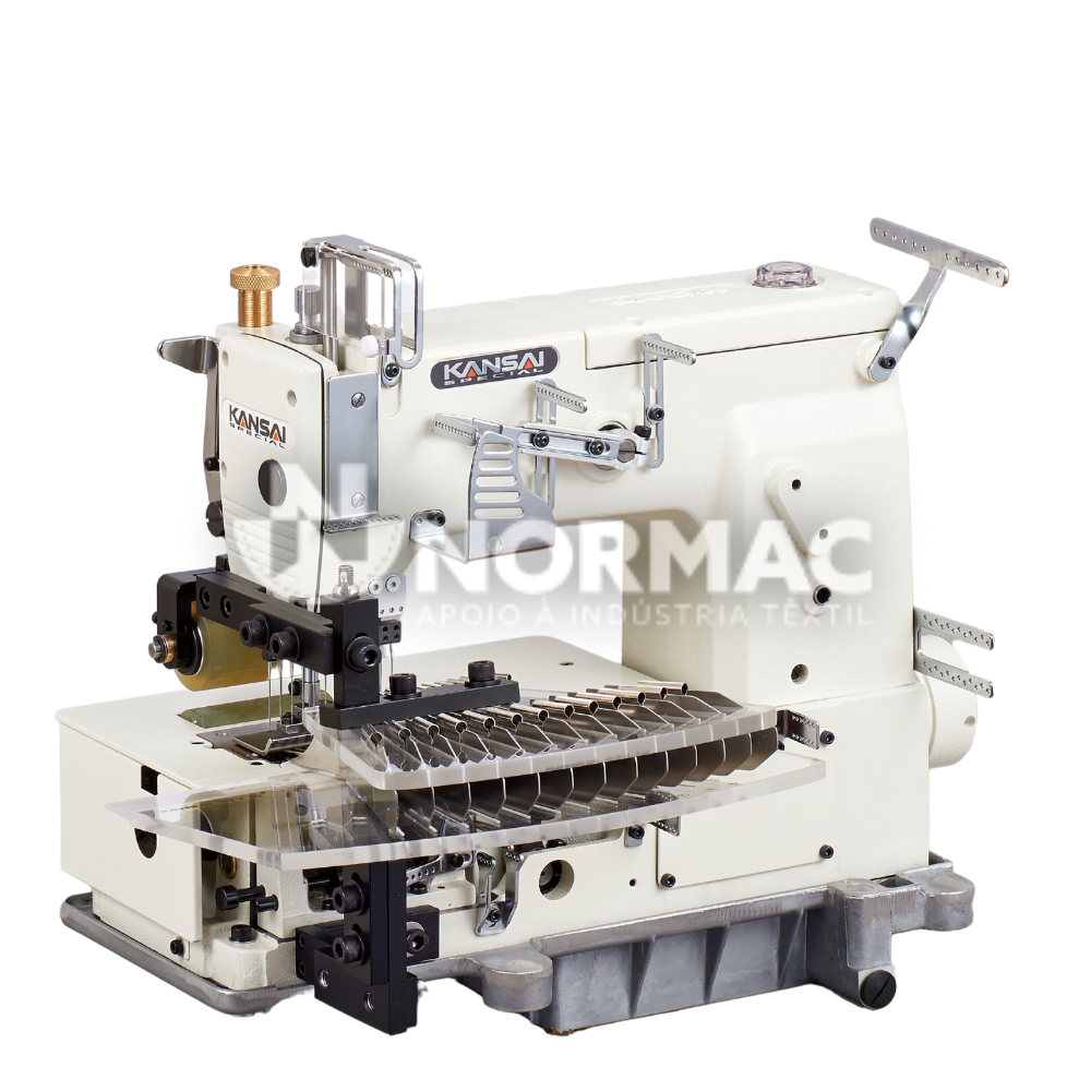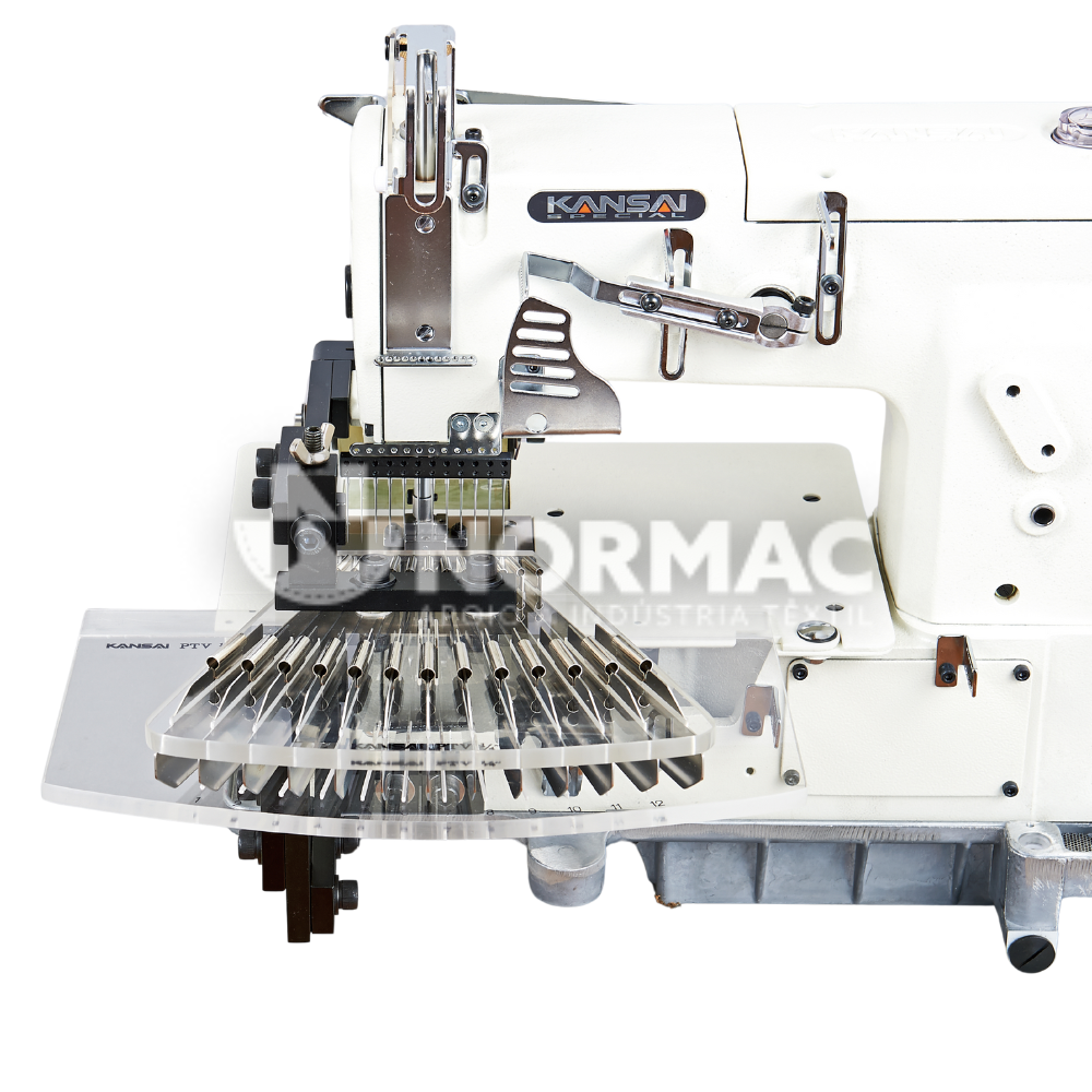 Máquina de Costura de Ponto de Cadeia Duplo de 12 agulhas, base plana, equipada com aparelho para fazer nervuras.