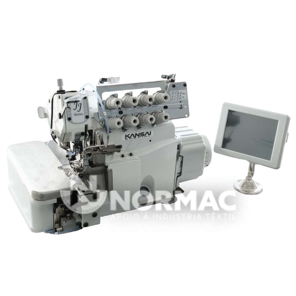 Máquina de costura de Corte e Cose 2 agulhas com sistema automático de inserção de ponta no inicio de costura, corte de linha e levantamento automático, o operário pode facilmente eleger no programador o tipo de costura, simples, com corte de linha ou com remate inicial.
