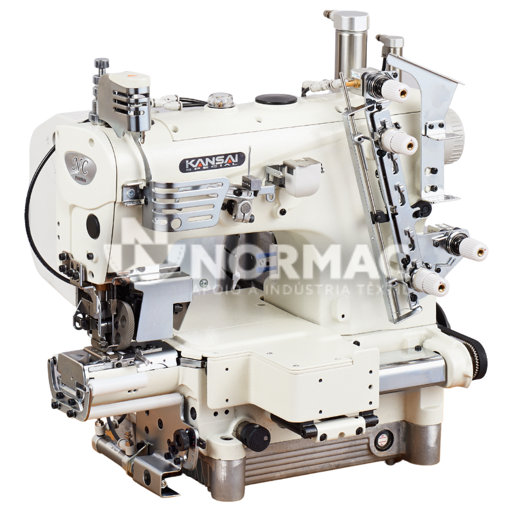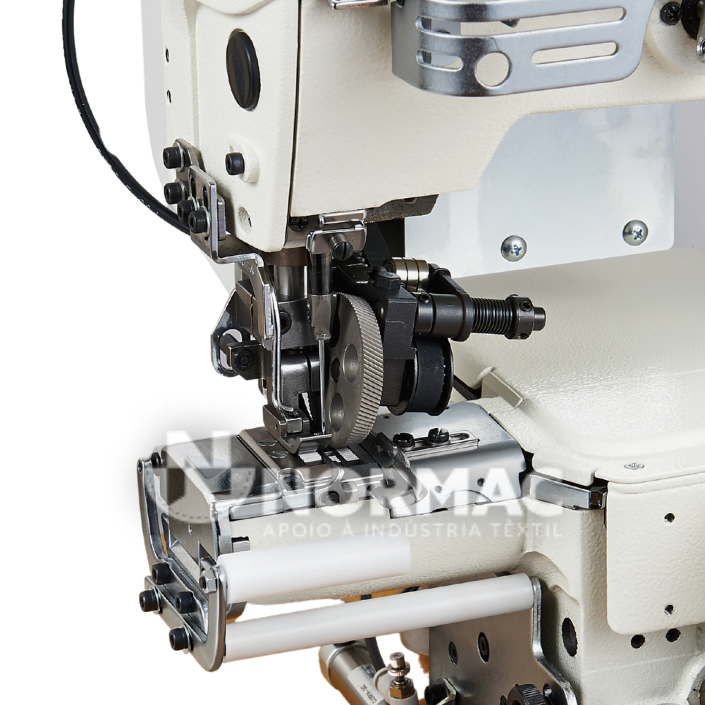 Máquina de Costura base cilíndrica 1 agulha de ponto de cadeia duplo com mecanismo de ponto condensado sistema de transporte arrastador com diferencial e rodizio lateral superior.