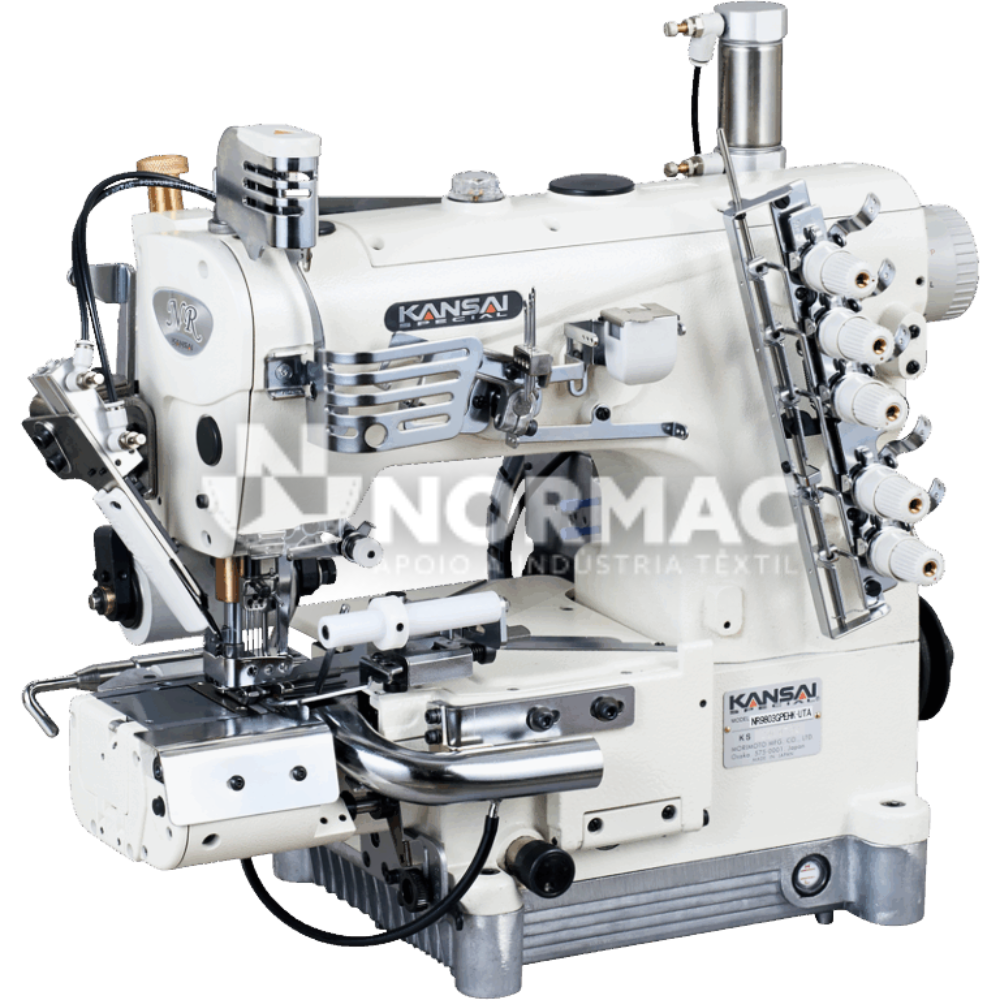 Máquina de recobrir base cilíndrica de 3 agulhas com recobridor superior, lâmina direita para aparar excedente de tecido, com puller traseiro para aplicar elásticos pré-fechados em roupa interior masculina.