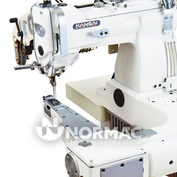 Máquina de Costura inglesa 3 agulhas, ponto cadeia duplo, transporte com diferencial frente trás ou esquerda direita no arrastador e puller traseiro com sistema de correia para trabalho extra pesado.