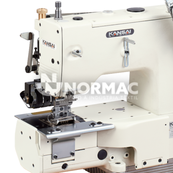 Máquina de Costura com base plana de Ponto de Cadeia Duplo 6 agulhas, com duplo transporte serrilha e agulha, com opção de puller traseiro, projetada para aplicar o cinto no cós da calça, em materiais médios a grossos como jeans e calças de trabalho.