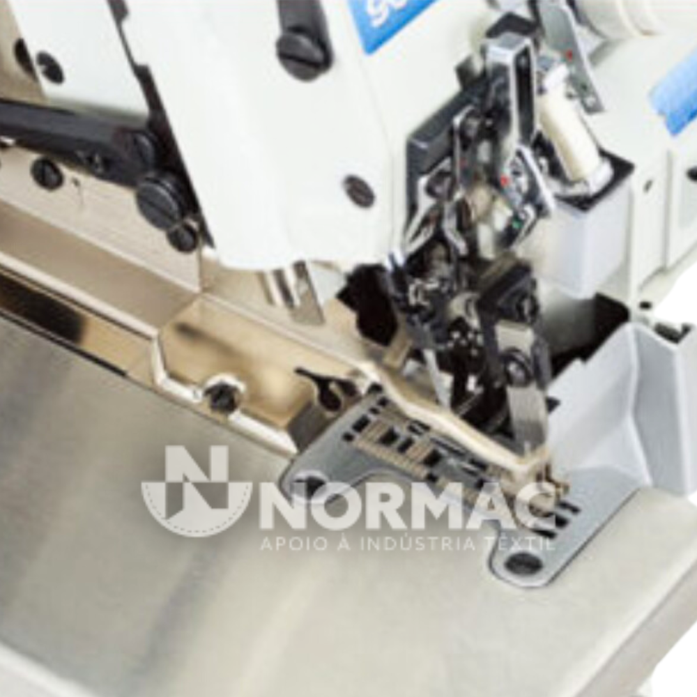 Máquina de Costura de Corte e Cose 2 agulhas com ponto interligado com transporte inferior e superior.