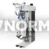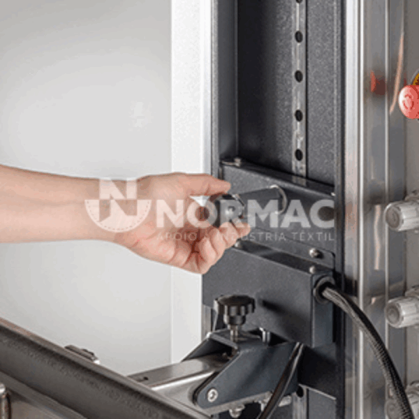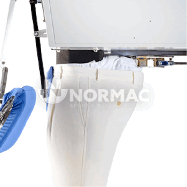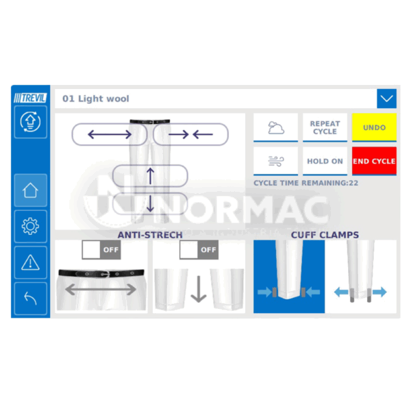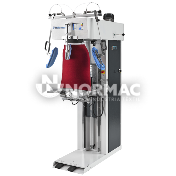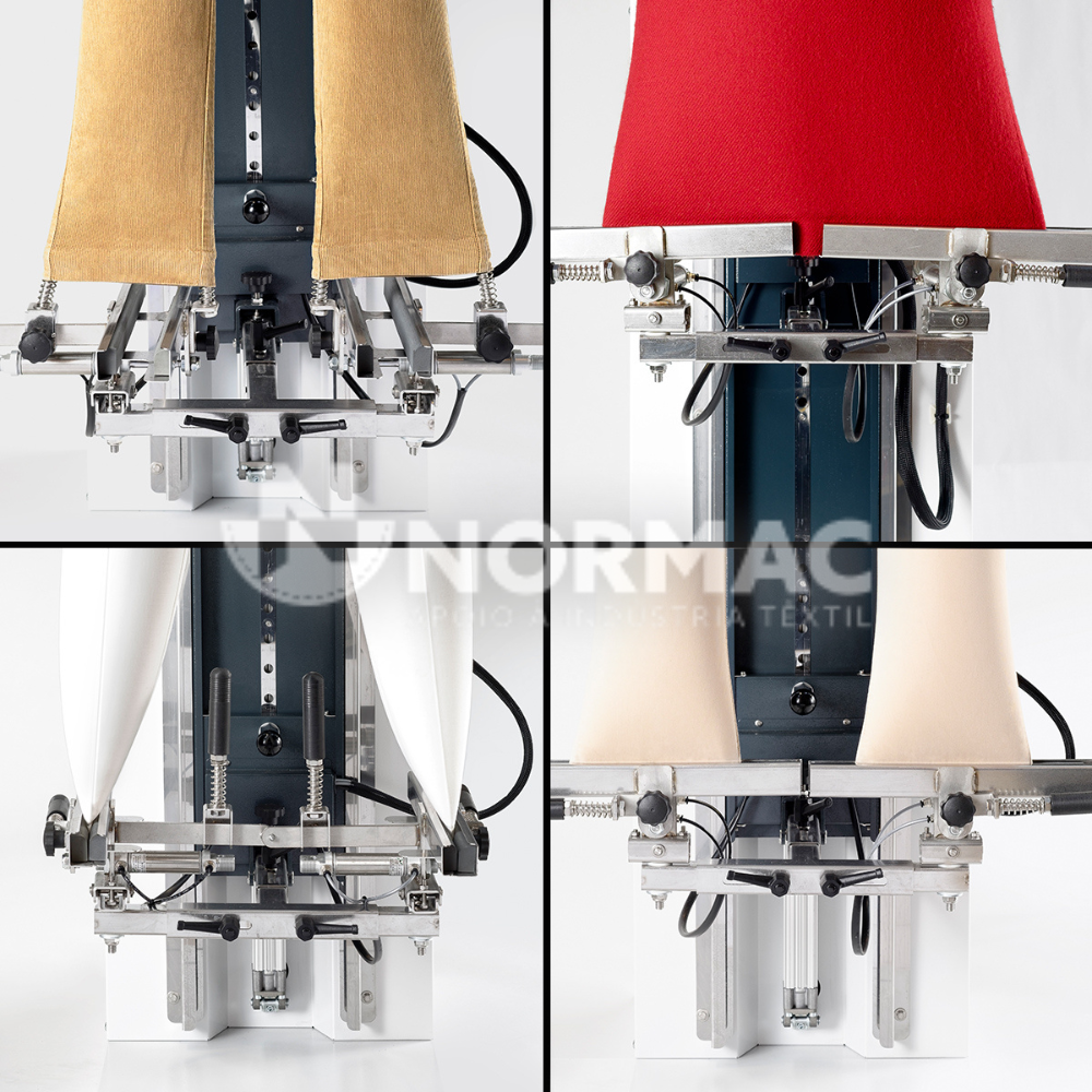 Topper de acabamento para engomar calças com tensão de cós de frente para trás e pinças pneumáticas de perneira. Adequado para todos os tipos de calças. Com ecrã tátil